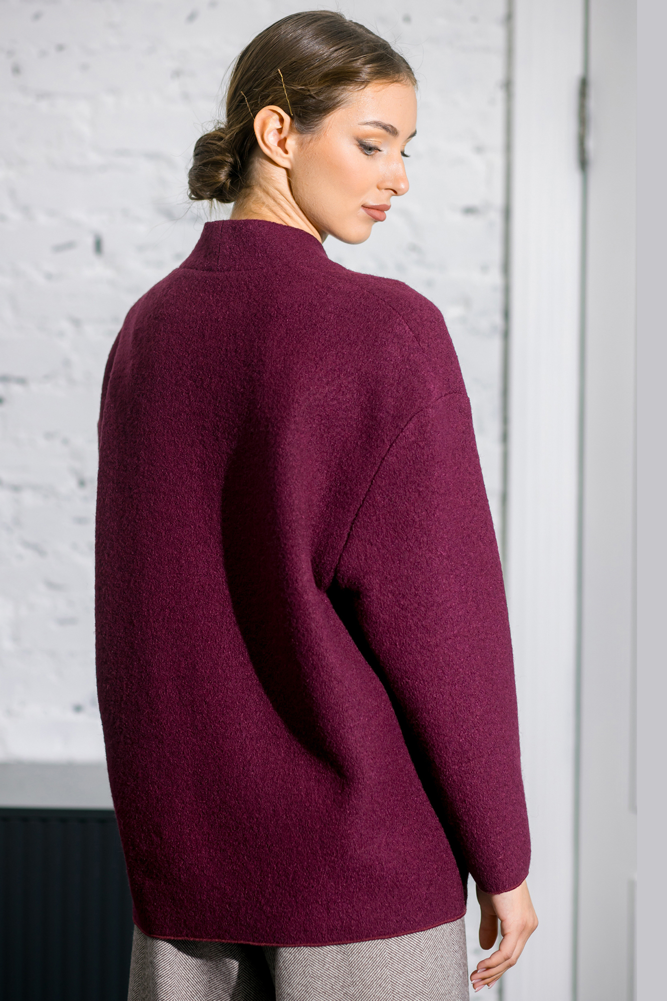 Knitted pencil skirt of tight jersey, elastic waistband. Side seam merges into an ornate cut on the back, where a narrow single-piece flounce with a front web is stitched to the lower part of the back, which brings exquisite charm to a seemingly ascetic pencil skirt.